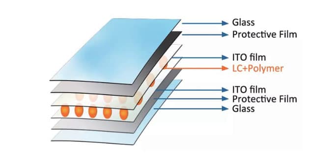 Two layers of ITO conductive film are filled with liquid crystal and polymer materials,So when the power off, the LC molecules are arranged in an irregular manner.meanwhile light is dispersed,So the film appears in an opaque state at this time,Now privacy protection is realized.